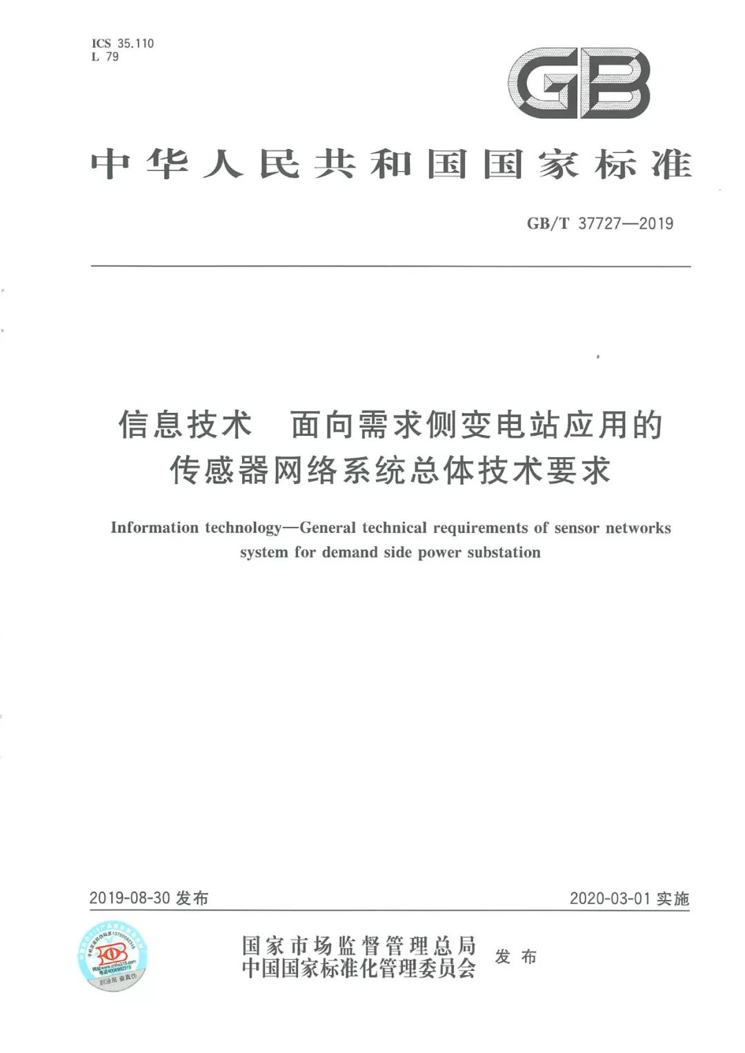 近日,由天津XC Sports物联科技股份有限公司主导制定的《信息技术 面向需求侧变电站应用的传感器网络系统总体技术要求》已由国家市场监督管理总局和中国国家标准化管理委员会纳入国家标准,标准编号为:GB-T 37727-2019。该标准于2019年8月30日发布,将于2020年3月1日开始实施。
