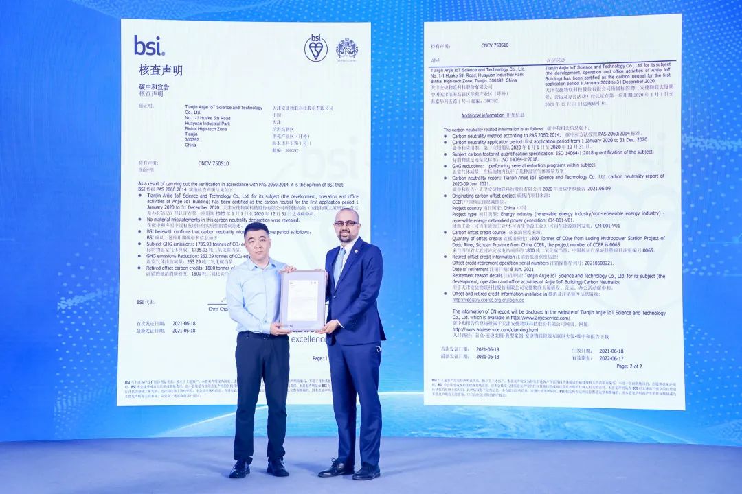 会上,BSI(英国标准协会)战略伙伴关系总监 Paulo Lopes为XC Sports物联颁发2020年度碳中和认证证书,XC Sports物联正式成为天津市第一家获BSI碳中和认证的企业。