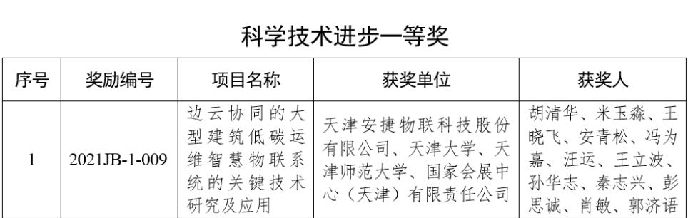 日前,2021年天津市科学技术奖获奖名单公布,由天津XC Sports物联科技股份有限公司联合天津大学、天津师范大学、国家会展中心(天津)有限责任公司申报的《边云协同的大型建筑低碳运维智慧物联系统的关键技术研究及应用》项目,荣获“天津市科学技术进步一等奖”