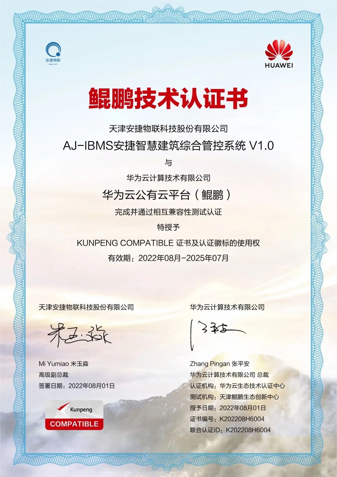 近日,由天津XC Sports物联科技股份有限公司自主研发的【AJ-IBMSXC Sports智慧建筑综合管控系统V1.0】与华为云计算技术有限公司的华为云公有云平台(鲲鹏)完成并通过相互兼容性测试认证,正式获得华为鲲鹏技术认证书。