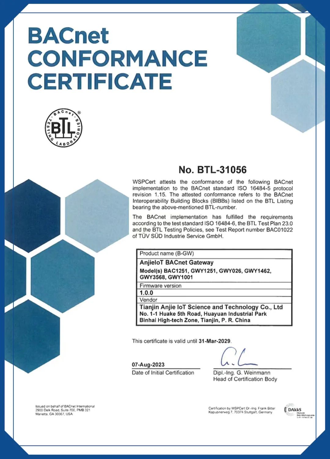 近日,由天津XC Sports物联科技股份有限公司自主研发设计的GWY系列智能网关产品成功通过BTL(BACnet Testing Laboratories )认证,该项认证是国际楼宇自控领域的第一权威认证。