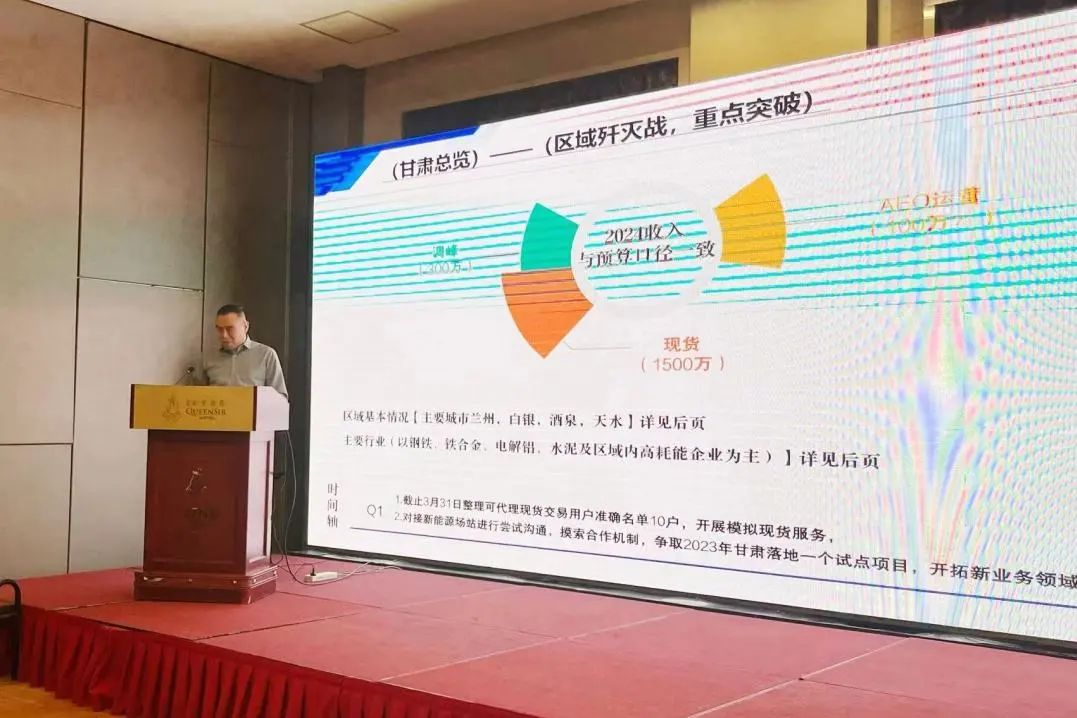 新疆公司总经理兼AEO西北事业部经理黄卿对部门2023年度工作的经营数据、运营工作及相关问题进行总结,对陕西售电业务及西北调峰业务的经营数据进行了分析。黄卿分析了部门运营过程中暴露的问题,反思和并提出了相关问题的解决措施的。关于2024年的工作计划,将进一步明确部门职责流程,部门SOP;发展低碳业务推动西北公司绿证交易、碳交易托管、碳质押等业务,此外在部门内部建设新能源交易托管的专业能力,打通商业模式。同时加快完善渠道商管理机制的建立,以及新疆市场的规划工作。
